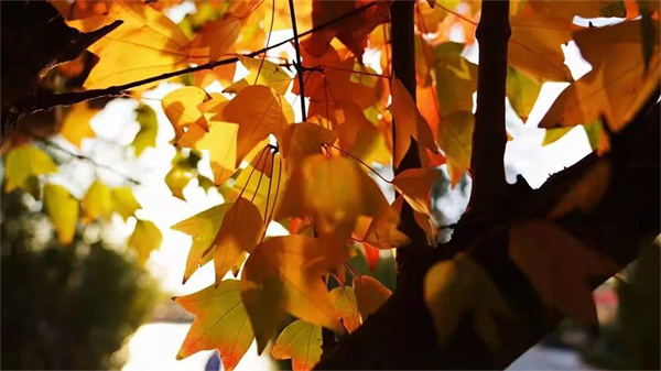 在冬日和煦的陽光下,紅葉色彩更加濃艷,微風(fēng)拂過的瞬間仿若一片燃燒的火海,美不勝收。