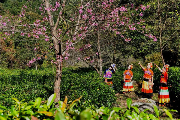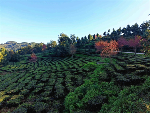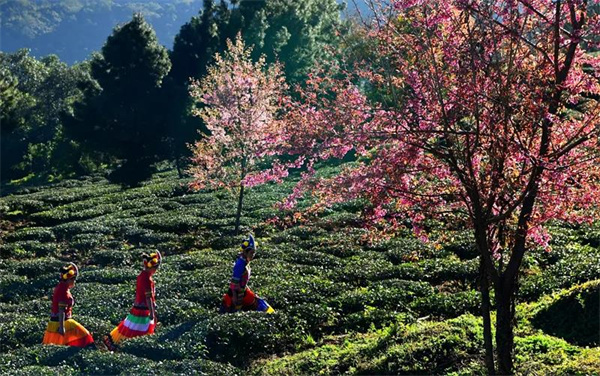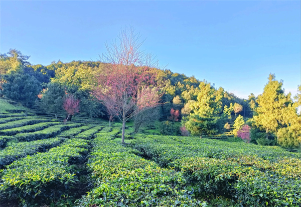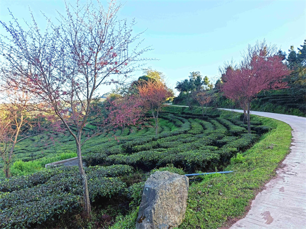 藍天映襯花愈紅,茶青與冬櫻花一同艷。萬畝有機茶園的開闊與蜿蜒里,碧波蕩漾的翠綠映襯著如霞似火的粉色櫻花,置身其中,始終被淡淡的粉色包圍,宛若仙境。