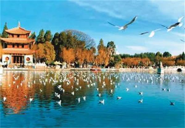 大觀樓,真是一美美四季,春有翠柳拂堤,夏有荷花滿池,秋天百花爭艷,而冬則因紅嘴鷗的到來越發浪漫。