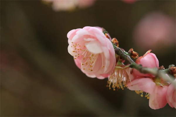 而那淡淡粉梅,則是嬌嫩羞怯地融進一片淡綠中,歡喜地躲著吹拂而過的寒風。