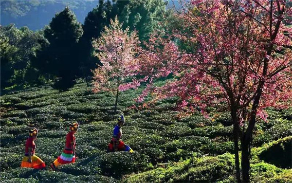 茶園、櫻花、遠山,宛若一幅色彩斑斕的油畫,滇中秘境最意外的春色悄然來臨。