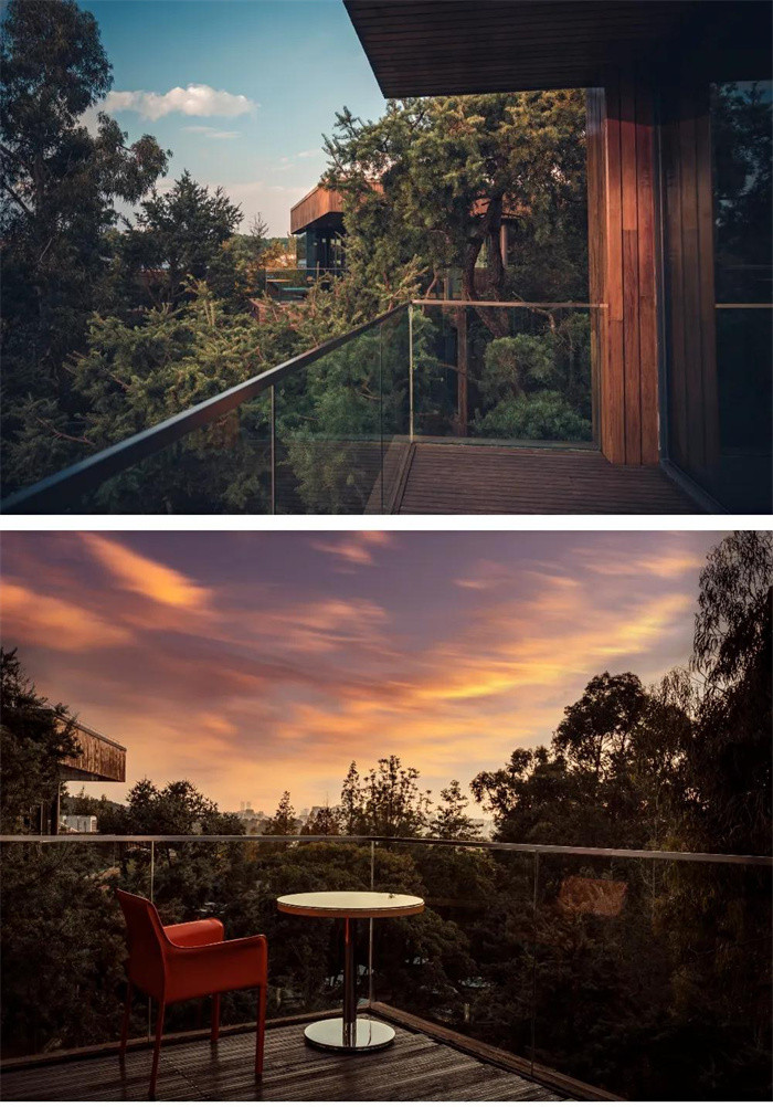 光陰流轉(zhuǎn),經(jīng)典永恒。它獲得包括RIBA英國皇家建筑師協(xié)會國際建筑獎、WAN世界建筑新聞網(wǎng)酒店建筑年度總冠軍、DFAA亞洲最具影響力設(shè)計(jì)獎等十余項(xiàng)世界獎項(xiàng)。四座高低錯(cuò)落的L形建筑依山勢起伏而建,外立面是漂洋過海而來的芬蘭杉木,曲折的步道和景觀廊橋連結(jié)木質(zhì)的建筑,恰到好處的中西合璧,即有“生態(tài)現(xiàn)代主義”的理念,也有“依山傍水房數(shù)間,行也安然,坐也安然”的意境。得天獨(dú)厚,獨(dú)此一家.酒店位于昆明市郊的鳳鳴山麓,與昆明世界園藝博覽園僅一門之隔,周邊有5A級景區(qū)世界園藝博覽園、金殿國家森林公園、金殿公園、云南野生動物園,國家植物博物館等五大公園環(huán)繞。距昆明市中心僅4公里,距離長水國際機(jī)場26公里,只需一瞬間就從人間煙火跨入一隅隱秘之境。酒店建立伊始,就以“創(chuàng)意綠色”為設(shè)計(jì)理念,占地面積7123 ㎡,綠地率 55%,建筑面積4238 ㎡,客房僅十六間,可遠(yuǎn)眺城市、可觀半山水景、可賞四季顏色、可享森林秘境。