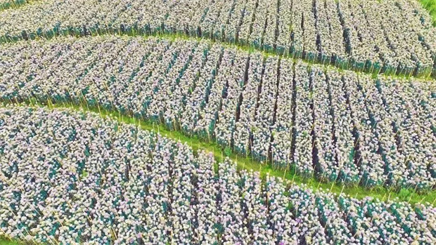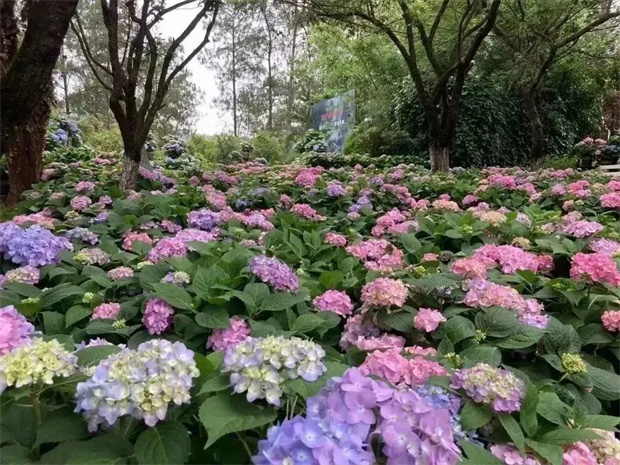 綠葉間探出頭來的小小花苞,不知最終開出來的是藍(lán)色還是粉色?帶著這樣的疑問,游人一腳便踏入了花海。