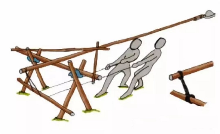 3、 拉動(dòng)連接竹竿的長繩,炮架才能發(fā)射,竹竿通過杠桿原理彈射出炮彈。