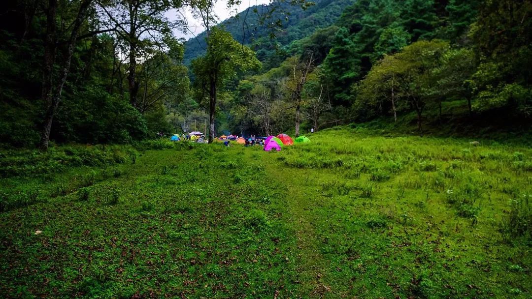 車開到大綠溪村口停好車,背上行囊,沿著蜿蜒的山路走著,小路的盡頭是一片開闊的草坪,綠意盎然,氣息清純,甚是愜意;偌大的草場,儼然一個天然大氧吧,極適合露營。