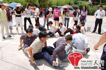 (2)、拓展規則及要求:2個隊同時進行,每個人坐在地上成一排,前面一個人的兩支手放在后面一個人的腳上,同時向前邁進,走進環形的卷心陣中,移動前行中如有人手掉地或者長龍中斷,從斷的地方開始后面的人就全部淘汰,前面的人繼續前行,直到最后到達終點結束游戲,按最后剩下的人多少來算勝負,如果有個別隊剩下的人數一樣,那時間用得最短的一隊獲勝。