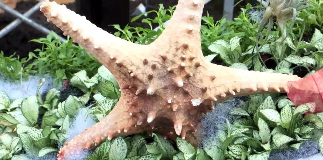 記者:“我身旁的這個白色的海螺以及一側的海星都是來自沿海地帶,那么這些海星其實并不是一些植物造型,或者是泡沫形成的,這個是真真切切的一個海里的生物。那么整個造型呢,安置在這樣一個立體花壇上,也是想體現(xiàn)生物、人物、動物和植物的一個共生。