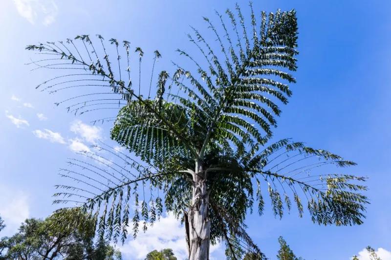 董棕也是熱帶雨林中的一員,生于石灰?guī)r山地區(qū)或溝谷林中,云南西雙版納東南部的熱帶溝谷雨林是它主要的分布區(qū)域之一。它高可達三十余米,即使熱帶樹木普遍高大,董棕也能“木秀于林”。葉片長可至七八米,寬可至五米,比小巴車還要大。十余片葉片聚生于頂端,真如巨傘一般。
