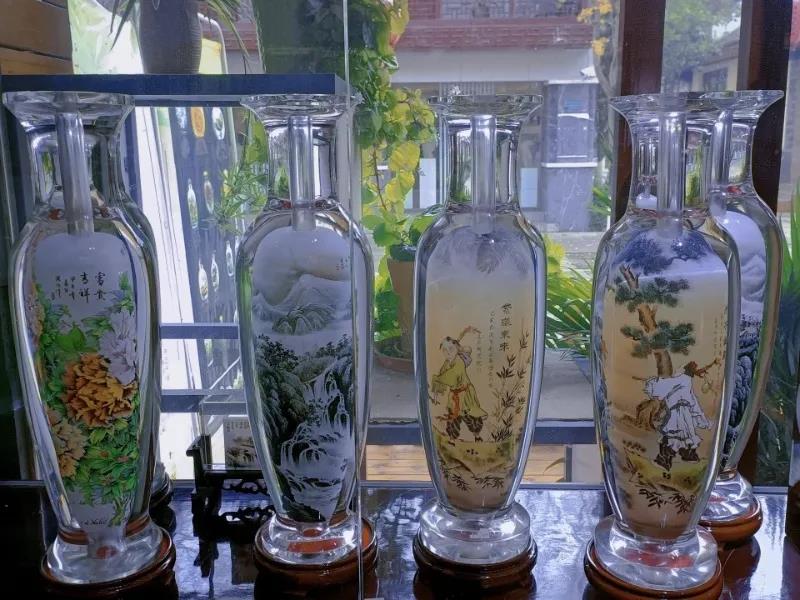 走進位于官渡古鎮的滇派內畫藝術研究中心,室內格外幽靜,古色古香的架子上,擺滿著繪有精致圖案的水晶球、玻璃壺、屏風……令人驚訝的是,這些圖案都繪在瓶子內壁。再往里走,你會看到伏案在桌前的學生手持一個水晶瓶,用一根筆尖有弧度的竹制的細筆在瓶子內部勾畫著……