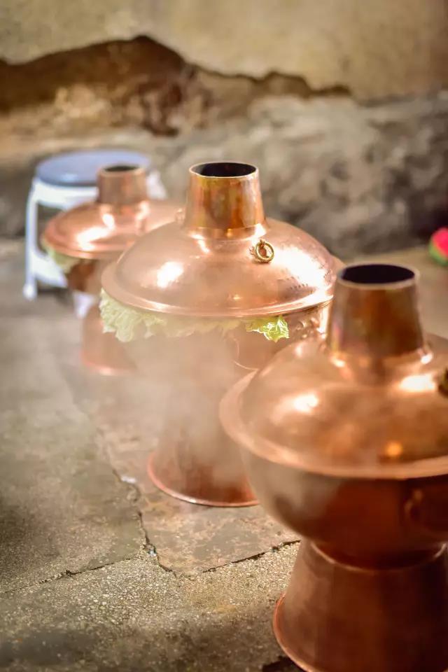 走進食府正房,左右兩邊各擺有餐桌,中央設有一茶桌、一方桌,方桌上陳列著一口銅鍋。煮通海炊鍋菜用的就是這樣的銅鍋。在古城中心街區,有多家店鋪售賣銅鍋,大大小小的各類銅鍋擺滿店面,最小的銅鍋夠四五人同時食用炊鍋菜,大的足夠十余人使用,有的銅鍋泛著锃亮的光,有的表面則附著一層黑色的“包漿”。