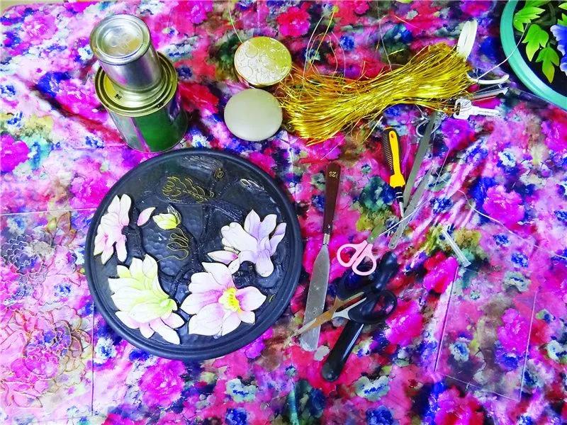 陳鴻斐對民族風格外青睞,她的陶藝工坊里充滿了鮮活的色彩。除了艷麗的插花,所有的工作桌上都覆上了一層色彩繁復的印花絲織桌布,十分搶眼。“平時生活和大自然中從不缺少美,可以從中提煉出配色、用光的道理,包括放在家里的瓶花,大師的優秀刺繡作品等各種藝術樣品都能帶來靈感,刺繡的顏色和過渡是我做陶經常參考和借鑒的。”陳鴻斐說,她閑暇時候經常觀察絲綢花面的光澤度和色彩搭配,桌面上的花朵圖案還能啟迪她作畫上色。