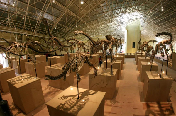 繞著溪流走到恐龍山頂,就到了恐龍大本營和遺址館。大本營內全是仿真的恐龍雕塑及各種與恐龍有關的游戲等,碰巧我們進館時間有些晚,人不算擁擠,看了六分鐘有關恐龍滅絕的電影,孩子嚇得縮成一團,待上樓之后,又象是到了一個快樂王國。可以和恐龍賽跑,競猜、提問。逛了一下午,大家都有些體力不支,對游戲也自然提不起精神,否則,與恐龍賽跑倒是一項不錯的運動,可腿腳發軟,在機子上踩幾下就沒力氣了,在工作人員的提醒下,我們又匆忙趕到遺址館。遺址館內全部是恐龍化石的組裝的骨架和零散的肢體展示,大的小的一應俱全。從零落的殘骸中依稀可以想像兩億年前恐龍生活的畫面,然而,導致他們集體滅亡的根本原因卻著實令人迷惑不解,一代霸主的共同殉難引起了多方面的思考,人類不也正面臨大自然的威脅嗎?各種天災的背后隱藏著怎樣的因果循環?人們總是在不知不覺間就破壞了自我賴以生存的環境,難平的欲壑就象無底深淵,一次次把人類自己推向險境,干旱、地震、海嘯、洪災等一系列的災難真是空穴來風嗎?盡管我不聽信人類會滅絕的謠傳,但我們生存的環境卻不得不令人擔憂。“皮之不存,毛將焉附?”我們只有把各種利益看淡一些,順應自然規律的發展,才會真正實現人與自然的和諧統一,過上幸福和快樂的生活。