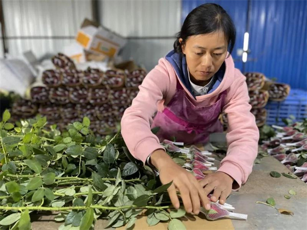 來到村里鮮切花分級的場地,村民們熟練地分揀、包裝著玫瑰花。正在包裝玫瑰花的李春燕告訴記者:“我們一天到這里打工有一百多元的收入,就近打工也比較方便。”
