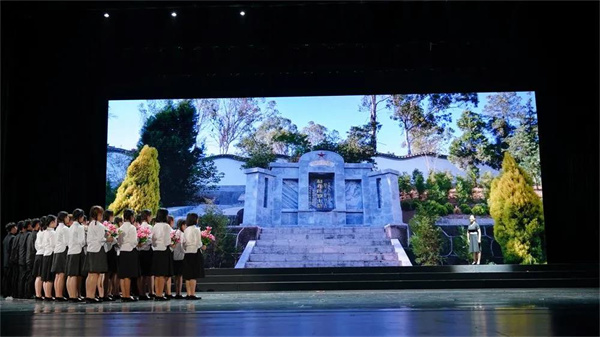 在精美的舞臺設計和演員們融情于景的生動演繹下,趙祚傳烈士的人生畫卷徐徐展現在觀眾眼前。當“五四”的浪潮襲來,他挺立潮頭,點燃了燎原的星星之火;他撰寫了《農民四字經》,成為黨組織宣傳群眾、動員群眾的革命經書;他是中共云南省特委書記,但為了給黨組織籌活動經費,四處奔走,賣房賣地;他三次入獄,飽受折磨,但依然堅定信念,和反動派進行不屈不撓的斗爭。