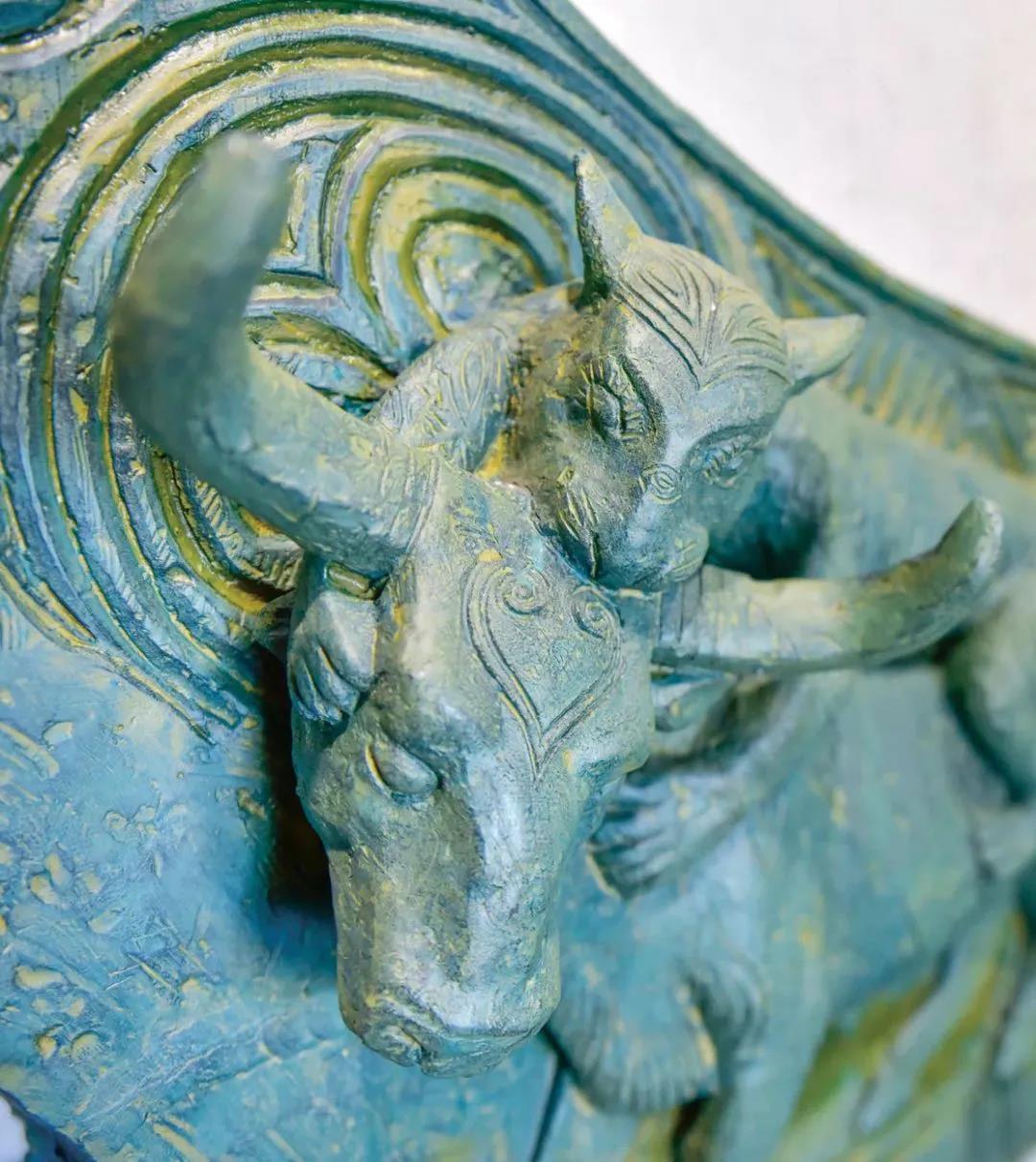 牛虎銅案,一件1972年出土自李家山遺址的青銅器,也把我們拉回到兩千多年前的那個早晨。那是戰國晚期,古滇國王侯逝世,墓地選在江川縣李家山,在貴族的指揮下,奴隸們把長達3.27米的槨安置在墓底,棺槨之間,墓穴的東、西、北三面,隨葬了上百件器物,以青銅器為主。器物層層放置,每碼滿一層器具附上一層土,形成豎穴。陪伴墓主人一起待在棺內的,是銅枕、裝飾品、銅卒和部分兵器。