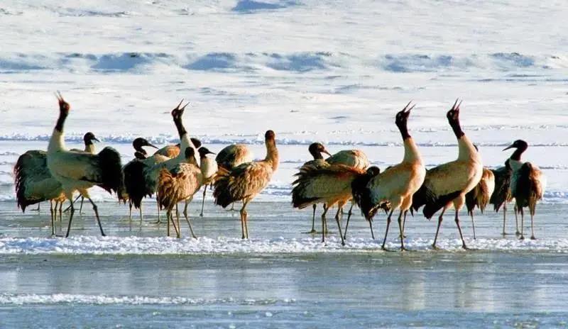 清晨,濃霧散去,遠處淺灘中一群黑頸鶴正在伸腿展翅,梳妝打扮,時而棲息,時而拍打著翅膀掠過湖面,它們的存在讓念湖的浪漫多了一層靈動。