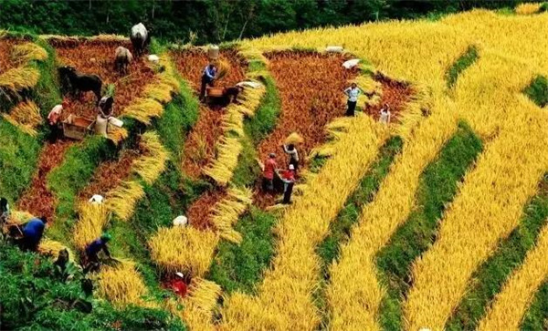 打稻谷的時候,先由老人做個祭祀儀式,打死一只雞獻(xiàn)給天地和稻神,感謝他們給予的豐收。整座山頭,伴著割稻鐮聲一起歡騰了起來。