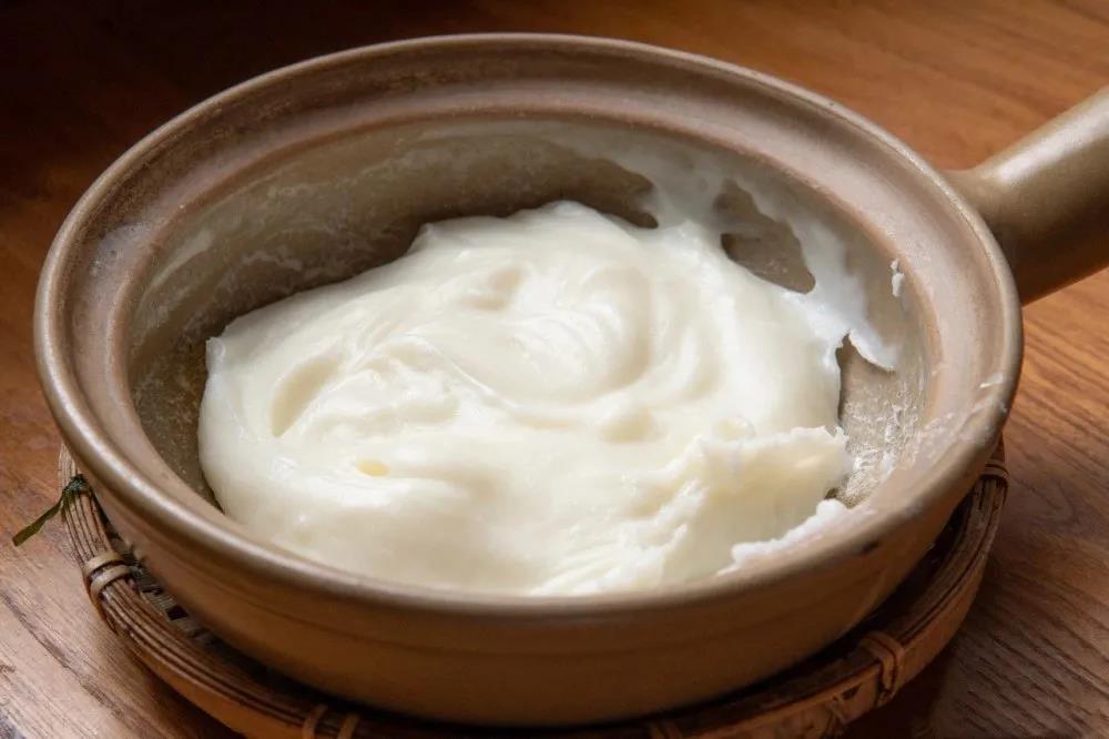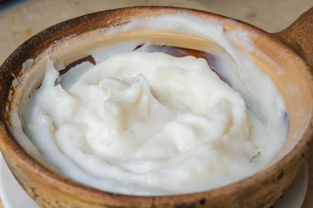 這是一道老昆明甜品,將大米打磨成粉后加入新鮮牛奶,過篩后獲得更加細膩的質地,然后裝入小砂鍋中不斷加熱攪拌至粘稠即可。